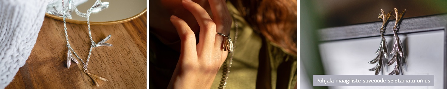 Imeilusad naiselikud kõrvarõngad "Hele" Aovalguse kollektsioonist. Aovalguse kollektsioon on inspireeritud Põhjala maagiliste suveööde seletamatust õrnusest. Ehe pannakse teele Lummuse signatuurkarbis.